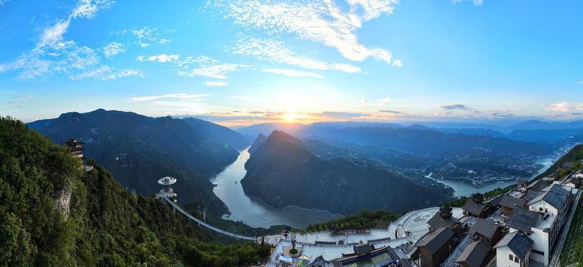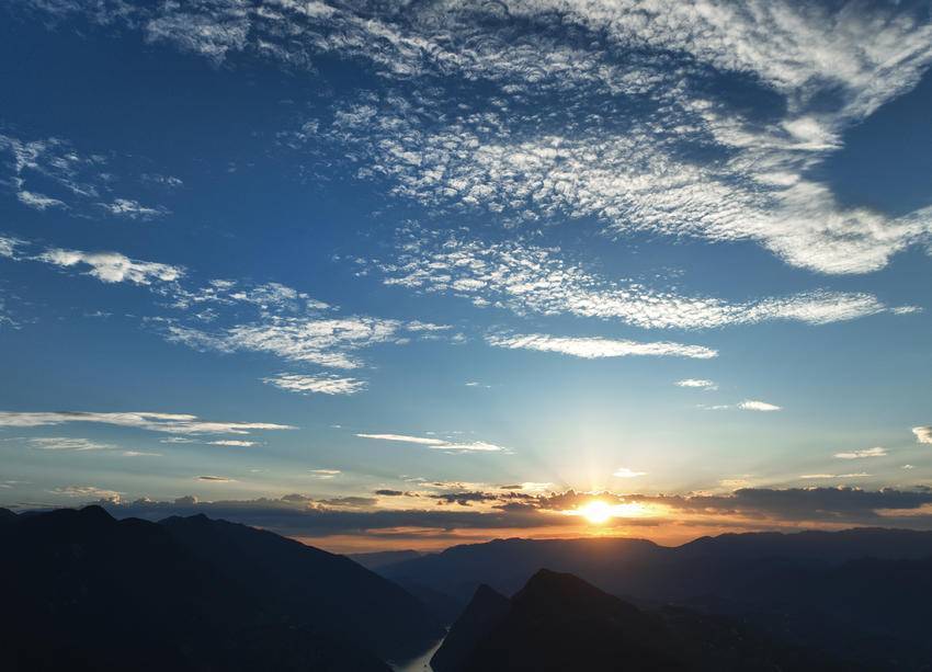 盛夏的傍晚,巴东县长江巫峡口烈日开始收敛,白云慢慢地探出头,肆无忌惮地在空中翻江倒海,洁白无瑕,姿态万千,展露它的温柔之美。突然,天边出现了一道亮丽的红霞,蔓延开来,白云变成了彩云,西边的天际也被染红了,穿透云层的余晖洒落在房屋、树木、大地时,温馨而又温暖。